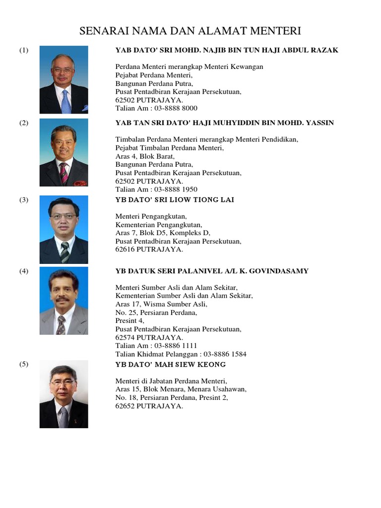 Senarai Nama Dan Alamat Menteri