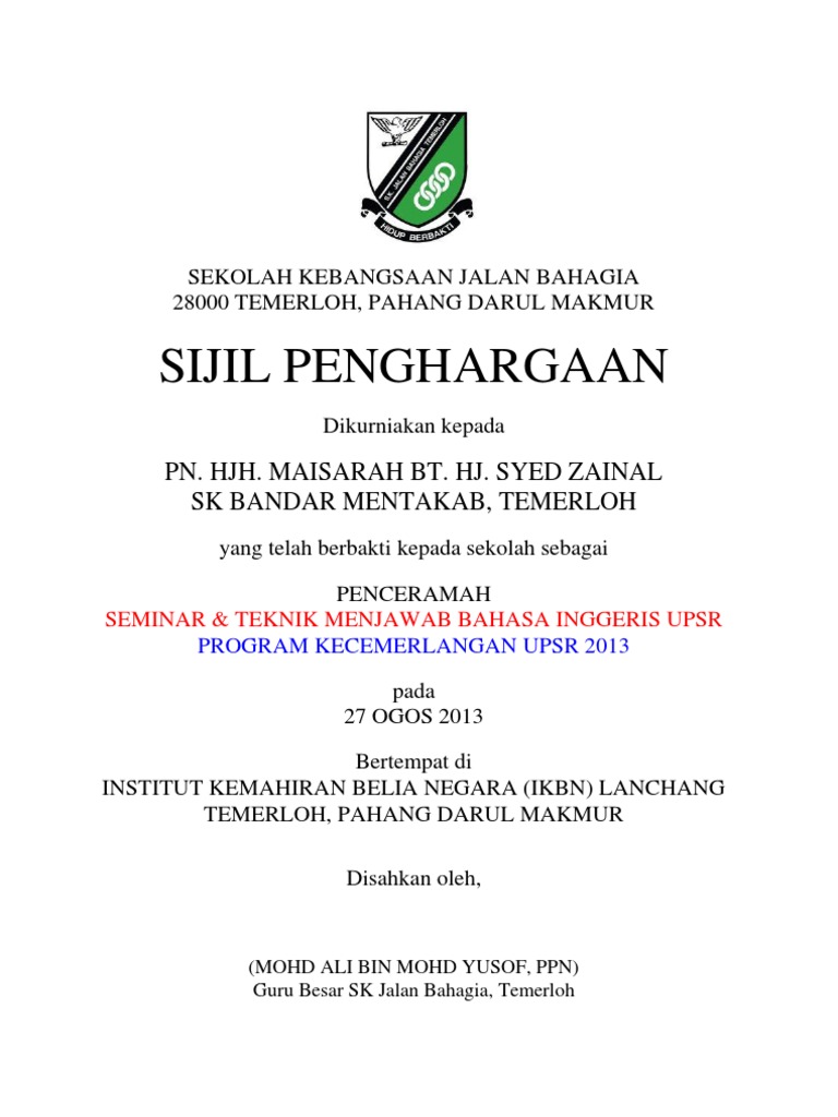Contoh Sijil Penghargaan Dan Boleh Diedit