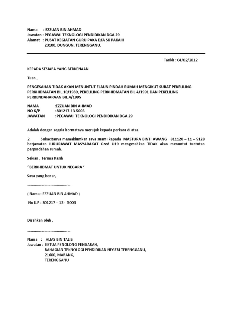 Contoh Surat Rayuan Tuntutan Elaun Pertukaran Kosong Kerjo