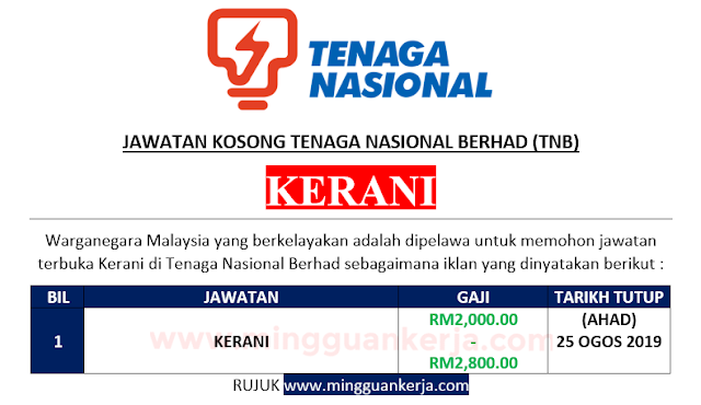Jawatan Kosong Kerani Di Tenaga Nasional Berhad Tnb Sehingga 25 Ogos 2019 Mingguan Kerja