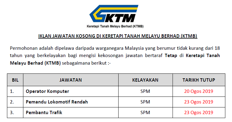 Jawatan Kosong Keretapi Tanah Melayu Berhad Ktmb Kelayakan Minimum Spm Jawatan Kosong Kerajaan Swasta Terkini Malaysia 2020 2021