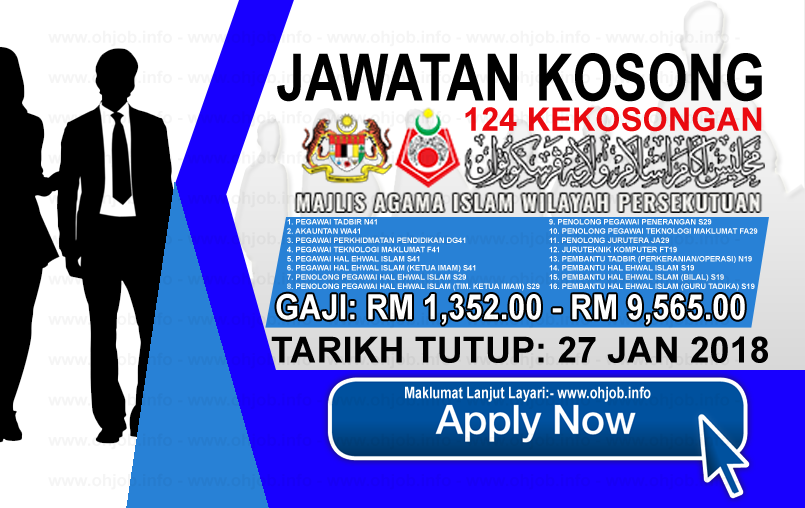 Jawatan kosong terkini di majlis agama islam wilayah persekutuan maiwp 27 januari 2018 permohonan adalah dipelawa daripada warganegara malaysia yang berkelayakan dan mempunyai komitmen yang tinggi untuk berkhidmat di majlis agama islam wilayah persekutuan maiwp dalam jawatan seperti berikut. Berikut merupakan maklumat iklan kerja kosong yang ditawarkan oleh majikan terlibat. Jawatan kosong mara 30 november 2018. Maklumat kekosongan ini adalah seperti yang diiklankan.