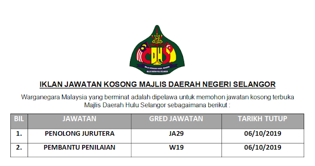 Jawatan Kosong Di Majlis Daerah Hulu Selangor Mdhs 6 Okt 2019 Kerja Kosong 2020 Jawatan Kosong Kerajaan 2020