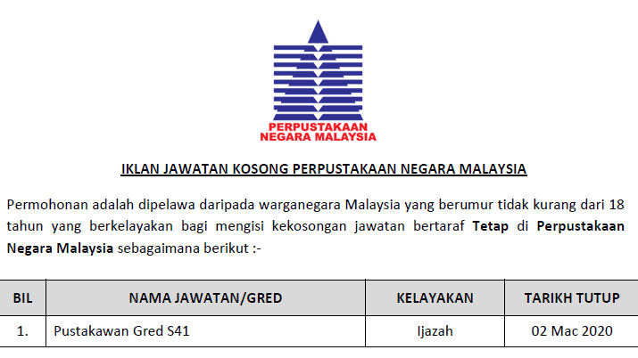 Jawatan Kosong Di Perpustakaan Negara Malaysia Tarikh Tutup 02 Mac 2020 Jawatan Kosong Kerajaan 2020 Terkini