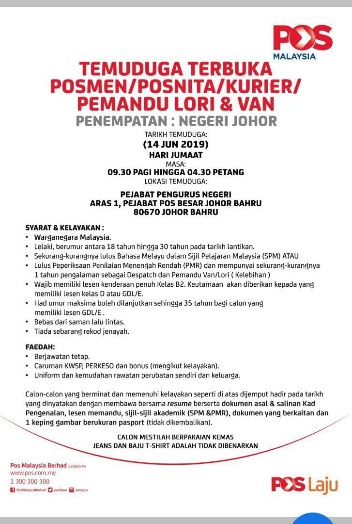Temuduga Terbuka Di Pos Malaysia Berhad 20 April 2019 Jawatan Kosong Kerajaan Swasta Terkini Malaysia 2020 2021