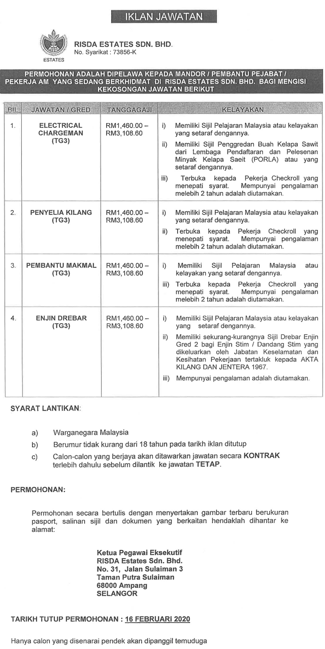 Jawatan Kosong Terkini Risda Pengambilan Kerani Penyelia Pemandu Eksekutif Operasi Di Buka Kerja Kosong Kerajaan Swasta