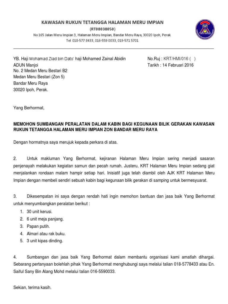 Surat Mohon Sumbangan Kerusi Meja Dan White Board