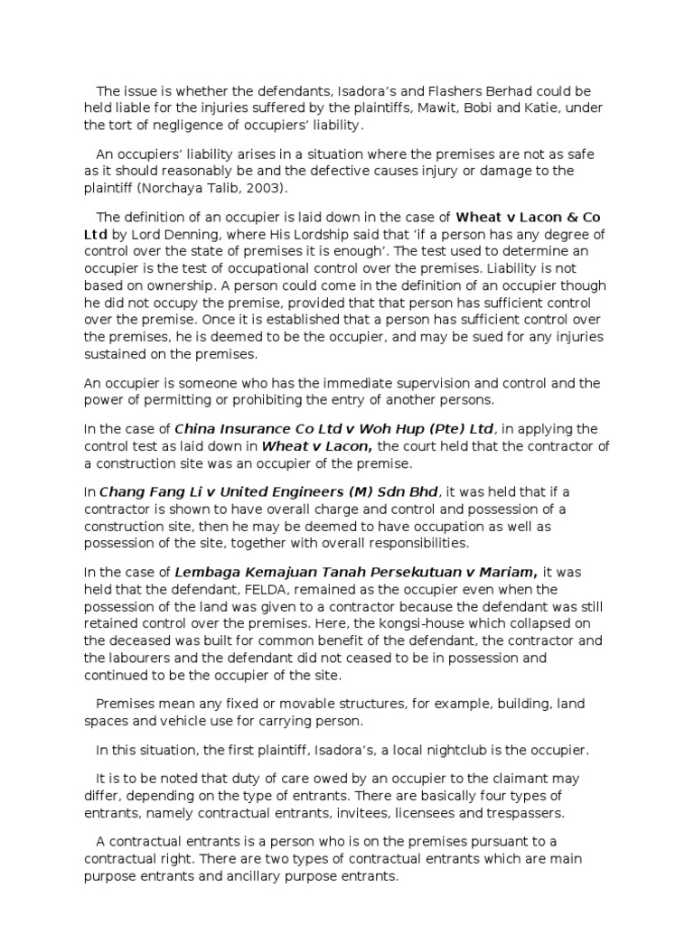 Mariam 1984 1 clj 225. 1984 1 clj rep 197. Per lord denning in wheat v lacon co ltd. The contractor of a construction site was an occupier of the premises prepared by.