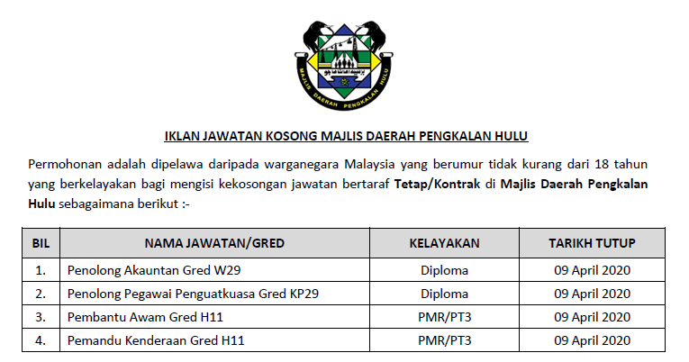 Jawatan Kosong Di Majlis Daerah Pengkalan Hulu Mdph 29 Nov 2019 Kerja Kosong 2020 Jawatan Kosong Kerajaan 2020