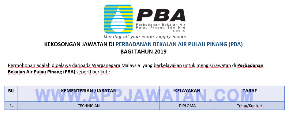 Jawatan Kosong Di Perbadanan Bekalan Air Pulau Pinang Pba Appjawatan Malaysia