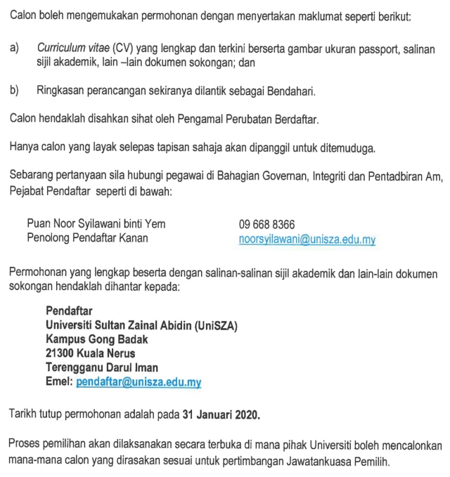 Permohonan Jawatan Kosong Di Unisza Universiti Sultan Zainal Abidin