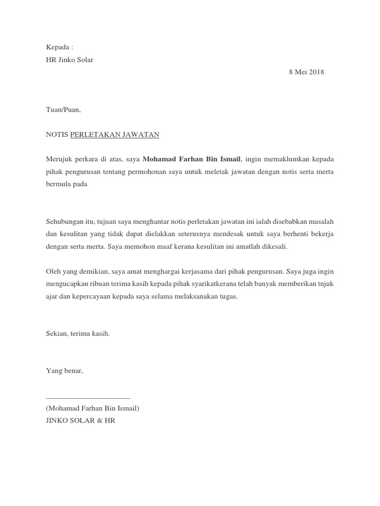 Xyz sdn bhd lot plo 88 jalan ubi kayu 81400 senai johor darul takzim. Surat rasmi notis berhenti kerja resignation letter perlu dihantar ke pihak majikan dengan alasan berhenti samada mendapat tawaran pekerjaan yang baru melanjutkan pelajaran dan sebagainya. Anda perlu menyediakan surat berhenti kerja surat perletakan jawatan kepada pihak pengurusan anda sebagai dokumen yang menjelaskan sebab pemberhentian kerja anda serta permohonan untuk melepaskan jawatan masing masing. Berikut ialah contoh surat berhenti kerja serta merta.