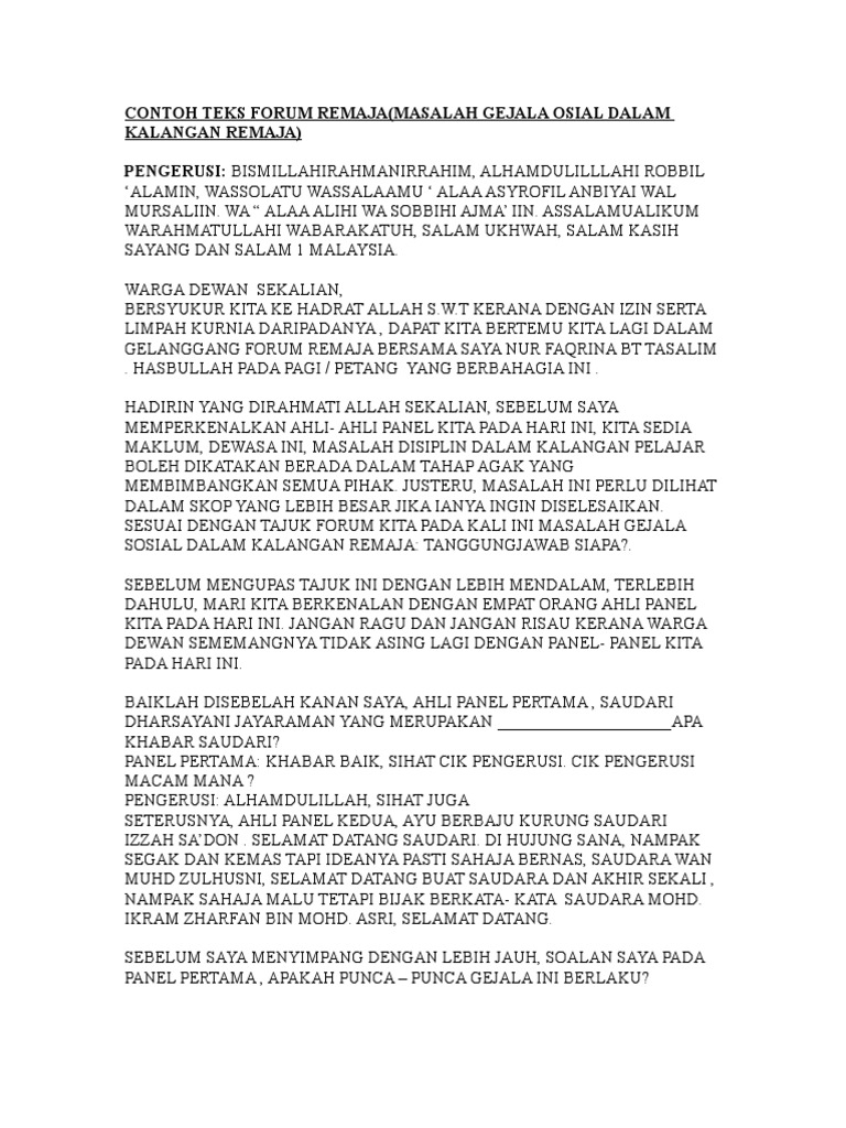 Contoh Teks Forum Remaja Masalah Gejala Osial Dalam Kalangan Remaja Pengerusi Bismillahirahmanirrahim Alhamdulilllahi Robbil